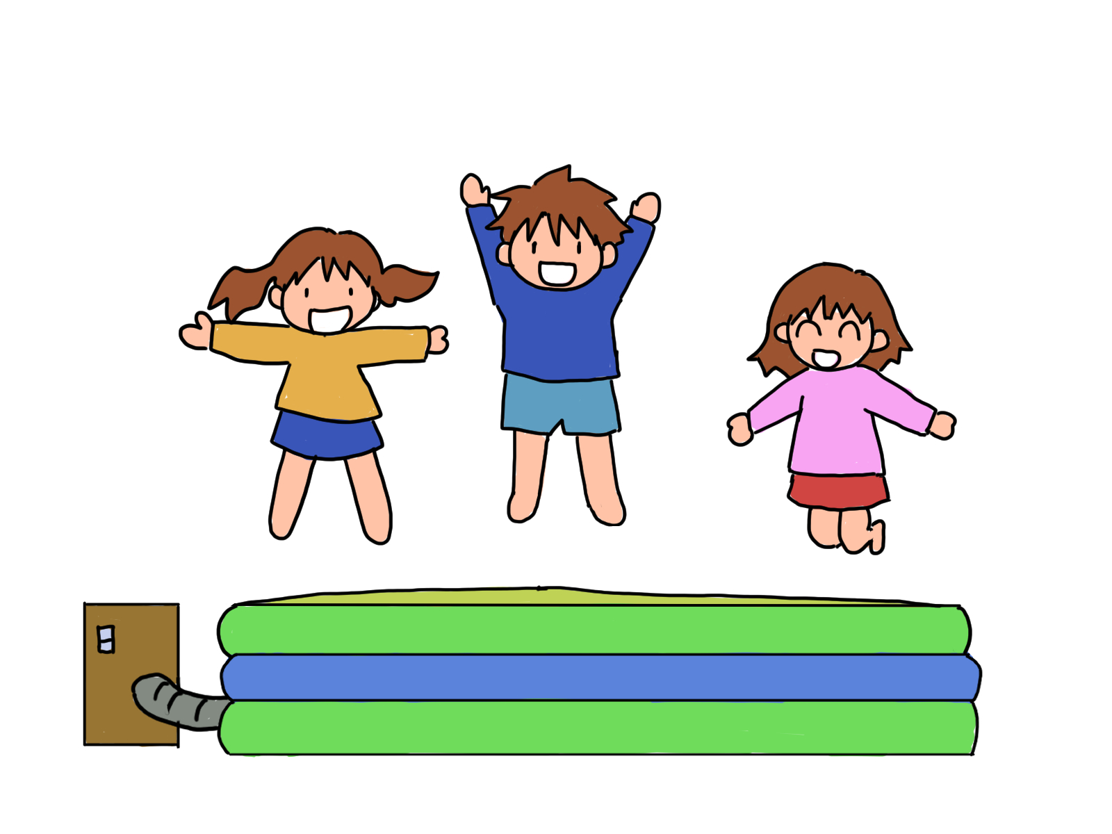 大きなトランポリンを楽しむ中で、いろいろな跳び方をして遊びます。